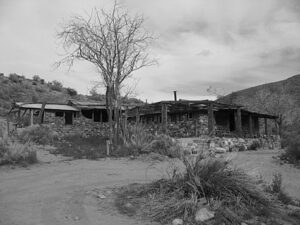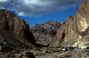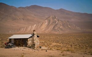 From Mengel Pass, we’ll make a stop at Geologist’s Cabin. Geologist’s Cabin is a one-room stone refuge built in 1930 by Asa Russell, also known as Panamint Russ. Complete with a fireplace, furniture, and even solar-powered lights, it’s one of the best-preserved backcountry cabins in Death Valley. Over the decades, it’s been maintained by volunteers and travelers, keeping it in remarkable condition. Just a short distance away is Striped Butte, a unique rock formation sticking up out the ground unlike anything anywhere to be found.